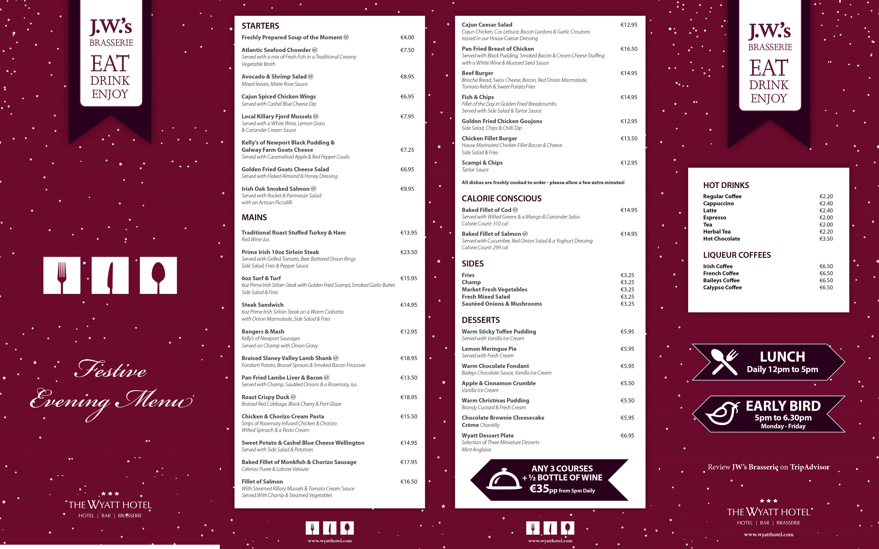 Exceptional dining offerings are available in the hotels food outlets of JW’s Brasserie, Park Terrace Wine Bar & Cobbler’s Bar. JW’s Brasserie is the Wyatt’s most popular dining venue. It boasts a great value daily Lunch Menu, scrumptious Deluxe Set Evening menu of a gourmet 2 or 3 course meal for just €20 for 2 courses and €30 for 3 courses per person. JW’s Brasserie has won a host of trophies down through the years and is in the running for more awards in the 2017 Irish Restaurant Association Awards.