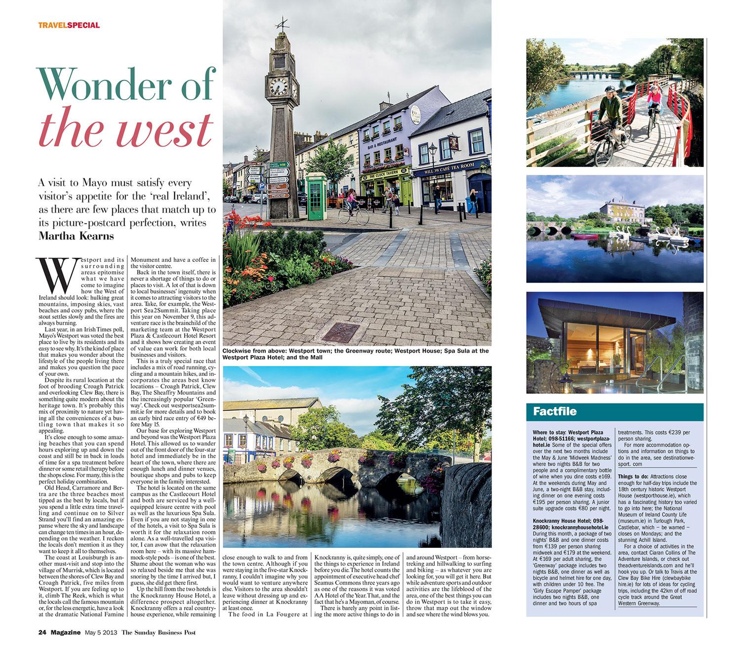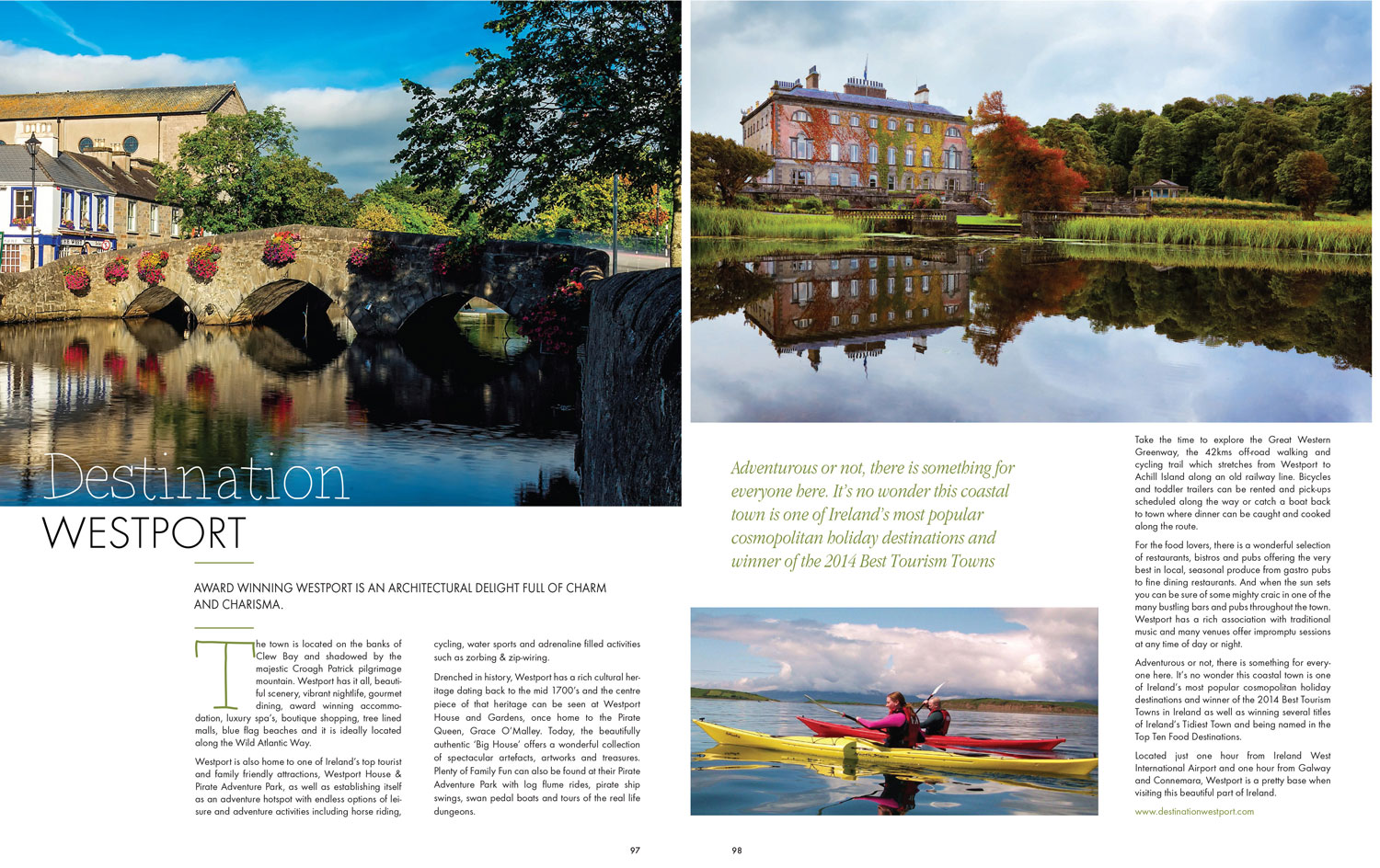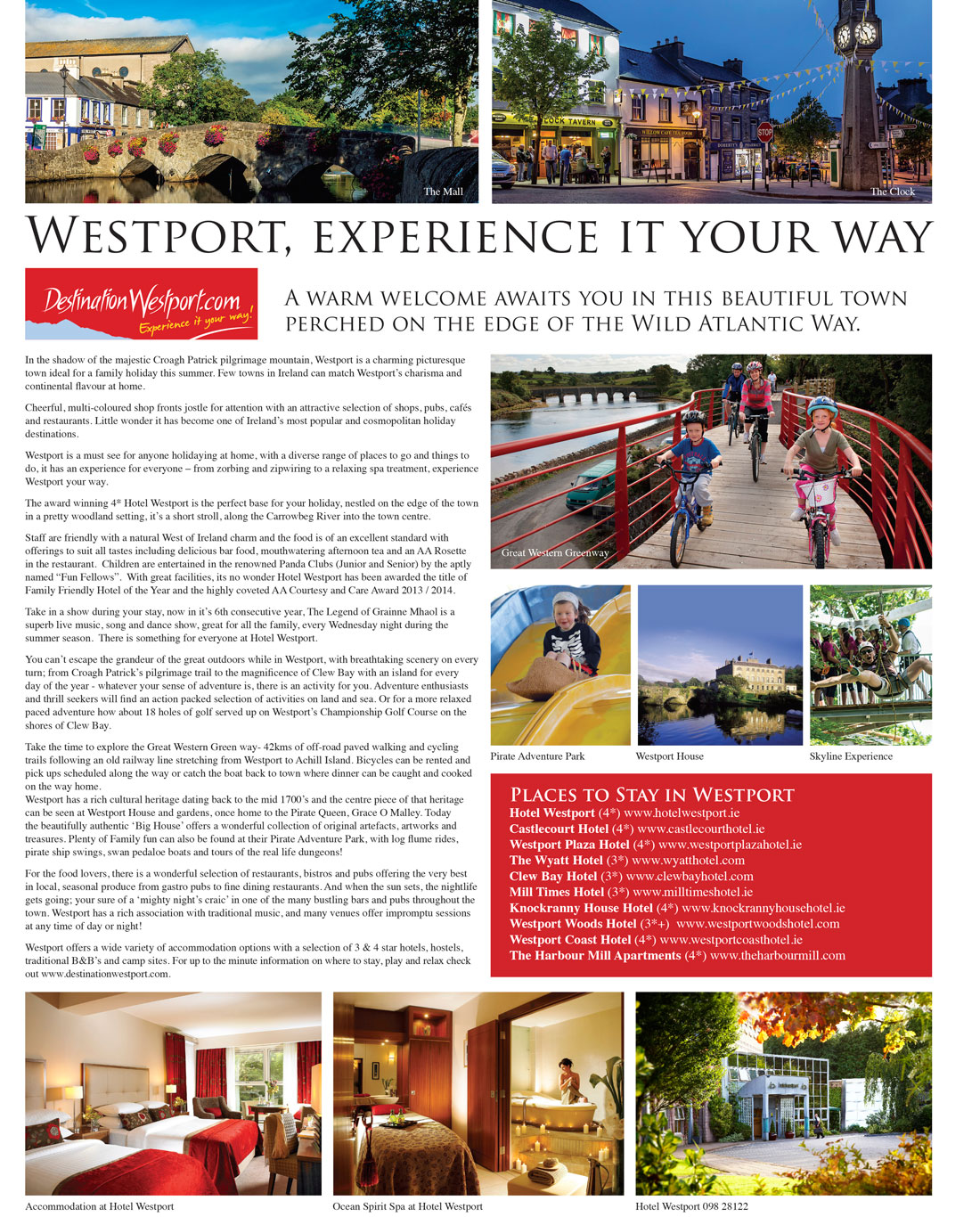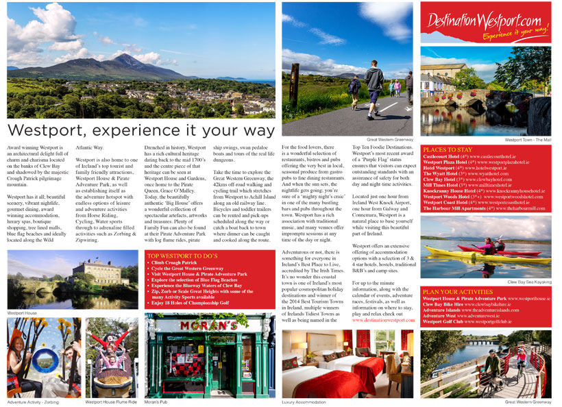 Destination Westport. Award winning Westport is an architectural delight full of char and charisma. The town is located on the banks of Clew Bay and shadowed by the majestic Croagh Patrick pilgrimage mountain…